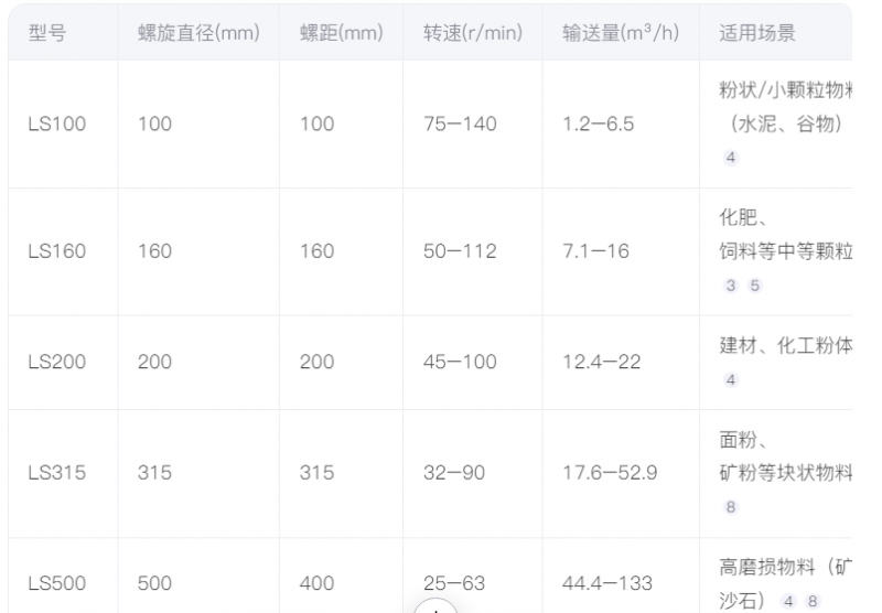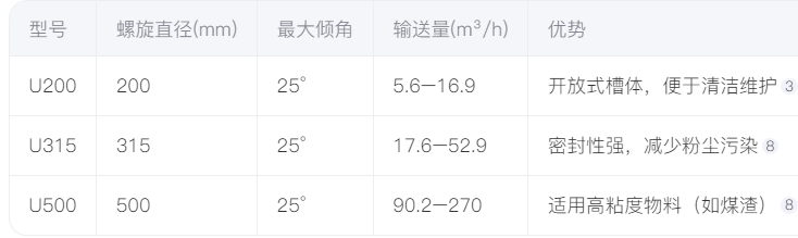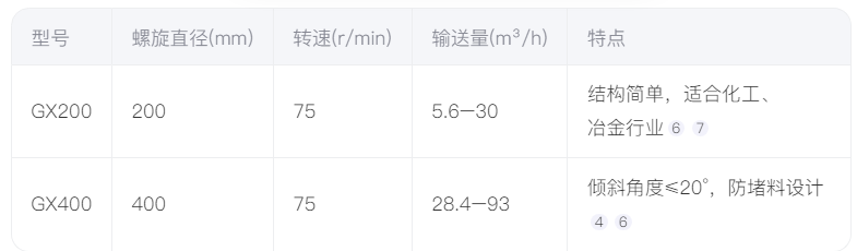 根據主流螺旋輸送機的結構類型及行業應用,其型號分類與技術參數匯總如下: