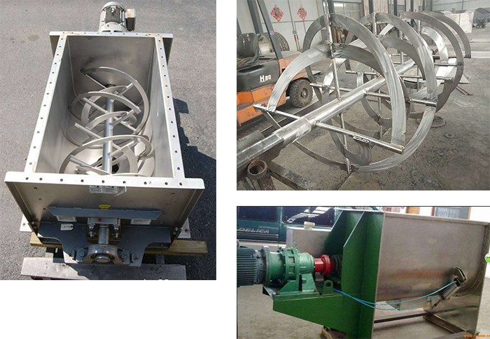 臥式混料機由U形容器、螺帶攪拌葉片和傳動部件組成;螺帶狀葉片一般做成雙層或三層,外層螺旋將物料從兩側(cè)向中間匯集,內(nèi)層螺旋將物料從中間向兩側(cè)輸送,形成對流混合。 螺帶混合機對于粘性或有凝聚性的粉粒體的混合以及粉粒體中添加液體及糊狀物料的混合有良好的效果,筒蓋可做成全開式門,以便于對設(shè)備進行清洗更換產(chǎn)品。